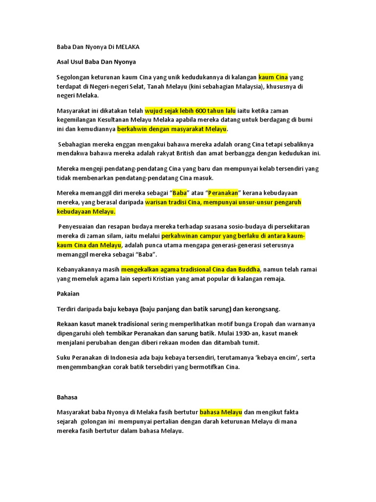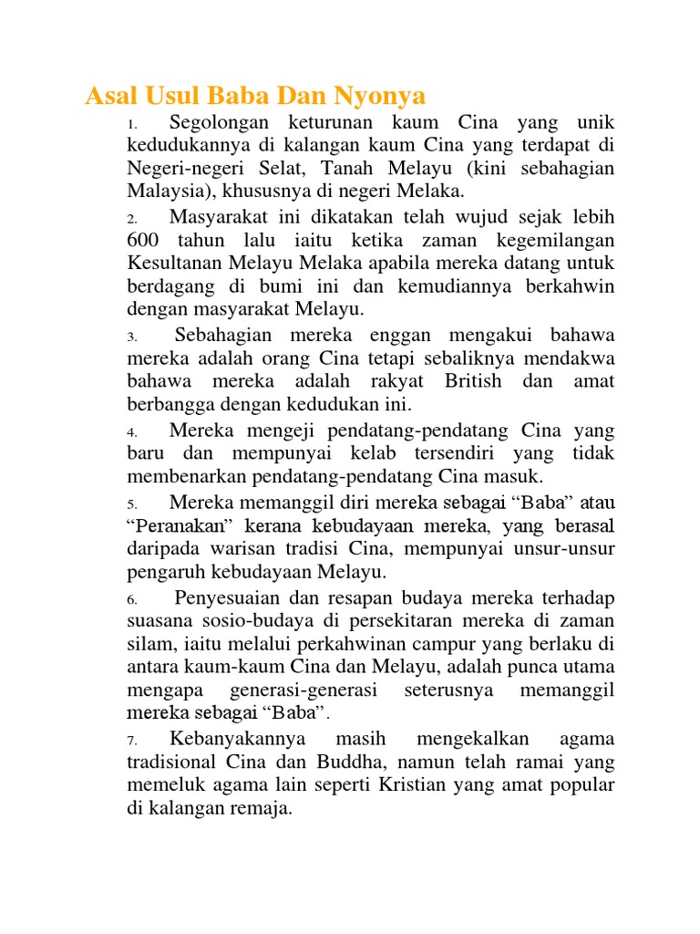 Masyarakat Baba Dan Nyonya Docx Document from demo.vdocuments.mx Asal usul baba dan nyonya. Dalam ' ensiklopedi islam ' disebutkan, bahwa jauh sebelum ajaran islam turun, masyarakat arab sudah memiliki dua hari raya, yakni nairuz dan mahrajan, keduanya berasal dari zaman persia kuno. Mereka wujud hasil dari perkahwinan campur di antara pedagang cina hokkien dengan wanita melayu melaka. Antara ruang lingkup kajian ini ialah cara pemakaian, pemakanan, perkahwinan, bahasa dan kepercayaan. Masyarakat baba nyonya dikenali juga sebagai kaum peranakan dan mereka merupakan kaum minoriti yang dipercayai berasal dari melaka. Namun, terdapat banyak versi yang diceritakan dalam usaha untuk mengesan asal usul dan identiti kebudayaan masyarakat hibrid unik ini yang disebut peranakan. Learn vocabulary, terms and more with flashcards, games and other study tools. Baba dan nyonya adalah segolongan keturunan kaum cina juga dikenali sebagai peranakan.